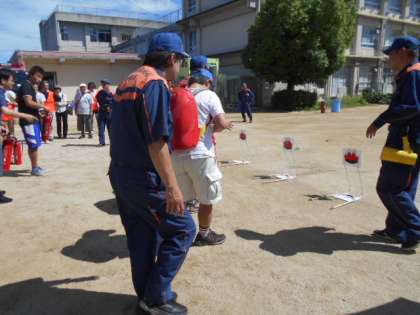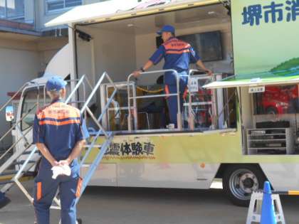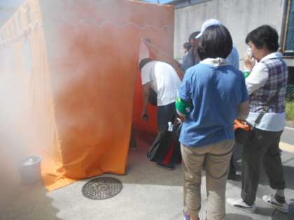 外での,煙体験,消火訓練,地震体験等の様子です。