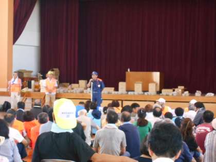 各コーナーでの体験の後は,閉会式にて,消防署の方かのら講評です。炊き出し訓練によるご飯や非常食の支給もありました。