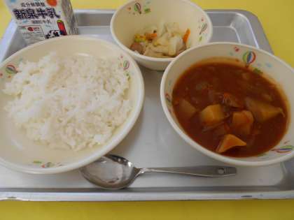 今日の給食はハヤシライスです。家庭料理のメニューであまり馴染みがないのか、給食を取りに来た児童の多くが「やったー!カレーや!」といいます。ルウや香辛料など、カレーとの違いを説明することもしばしばです。でも、カレーライスもハヤシライスも、残食は非常に少なく、間違いなく人気の献立です。