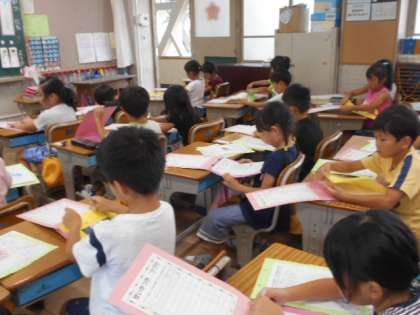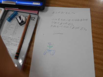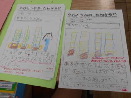 アサガオの観察カードを整理しています。たくさん花を咲かせたアサガオにメッセージを書いています。