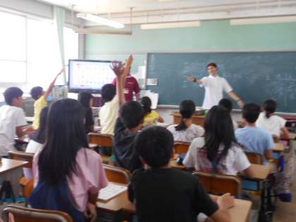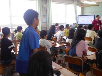 英単語を当てるゲームをします。アルファベットを適当に1つずつ言い,答えの英単語に入っていればその文字だけ明かされます。だんだん入っている文字がわかってきます。どこで答えの単語がわかるでしょうか?みんな楽しく取り組んでいます。