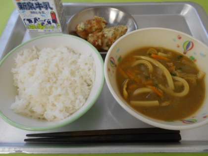 今日はカレーうどんと、ちくわの磯辺揚げでした。ちくわの磯辺揚げは、ちくわの天ぷら衣に磯(青のり)をまぶして揚げます。普通のてんぷらより、青のりの香ばしさが加わり、一層食欲をそそります。