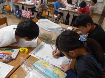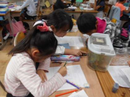 秋だと感じる虫や木の実を見付けて観察します。どんな様子かをしっかりと見て,ワークシートにかいています。