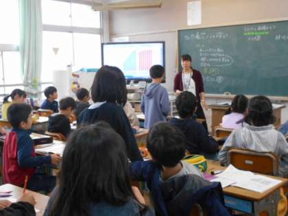 グラフをもとに,これからの食糧生産について考えています。人口は増加しても,耕地面積が増えない場合,どのようになるのか等を話し合っています,