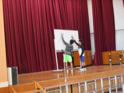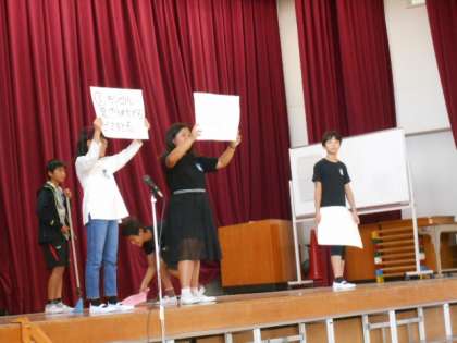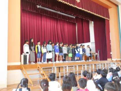 今日は体育館で児童朝会がありました。はじめに校長先生より,転入生の紹介がありました。新しい友達を迎え,みんなで一層なかよくしていきましょうね。整美委員会からは,掃除の仕方についての劇がありました。「はく」「ふく」「机を運ぶ」などについて,正しい方法を例をあげながら,わかりやすく説明する様子が素晴らしかったです。