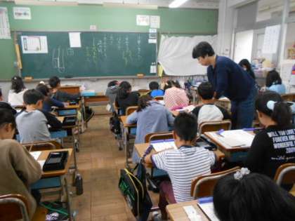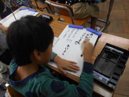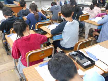 小筆を使って年賀状を書く練習をしています。大筆と少し使い方の違う小筆ですが,集中して取り組んでいます。