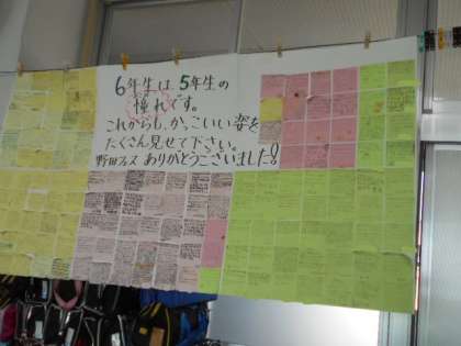 教室の横には,野田っ子フェスティバルで頑張った6年生に向けた,5年生からのお礼のメッセージが掲示されています。