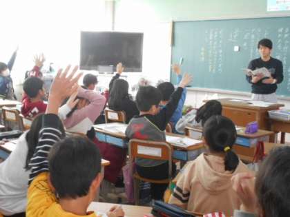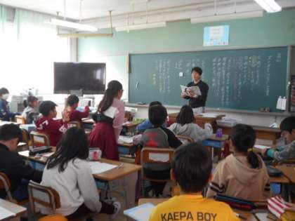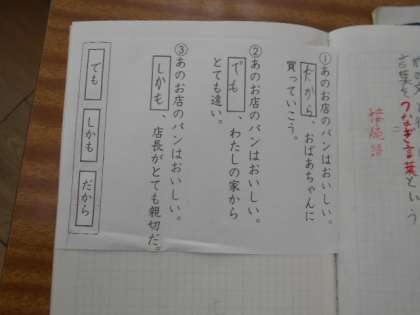文と文の意味のつながりを考えながら,接続語を使います。「だから」「しかし」など,どんな接続語が適切なのか,具体的な文章をもとに学習しています。