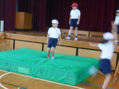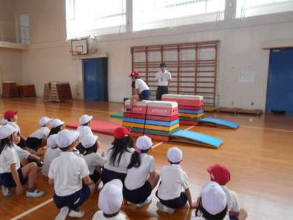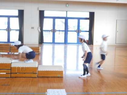 跳び箱や平均台,マットなどを使って運動遊びをします。その中で,跳び箱運動につながるような,体の感覚をつかんだり,手のつき方・着地の仕方を身に付けしたりします。