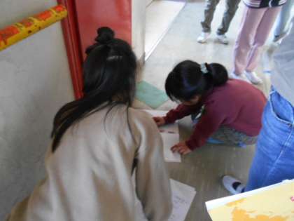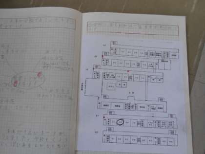 学校の中には,どこに消火栓があるのかを調べています。見付けたら,校内の地図に書き込んでいきます。