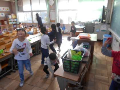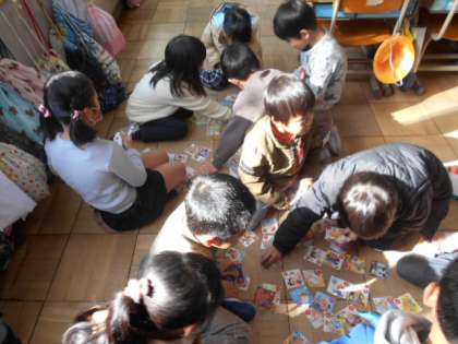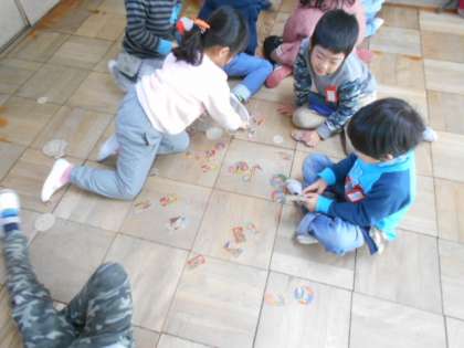 けん玉,お手玉,めんこなど,今の子どもたちはほとんどすることのない遊びです。みんな熱中しています。