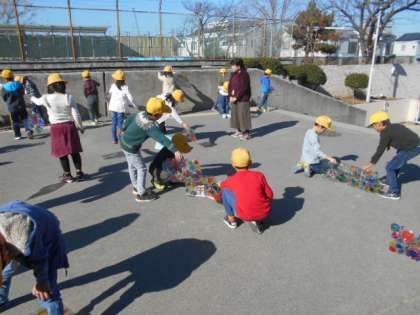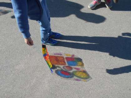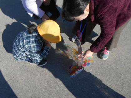 透明のプラスチックなどの光を通す材料を使ってつくっています。光を通すと,地面やかべにきれいなもようがうつります。