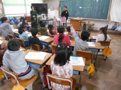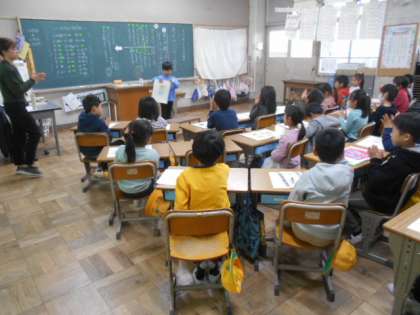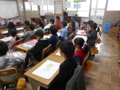 みんながあったらいいなと思うものを,絵に描いて説明をしています。話し方,聞き方に気を付けて発表をします。