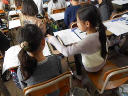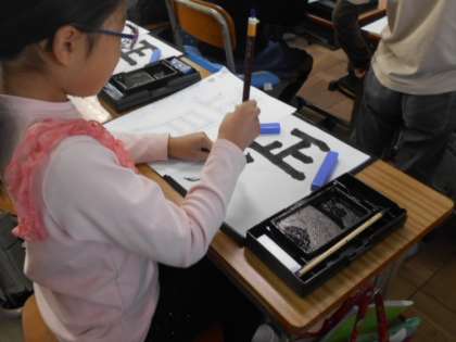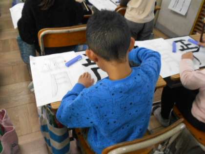 書初めをしています。筆の初めと終わり,力加減,姿勢などに気を付けて書いています。友達どうし見合いっこもしています。