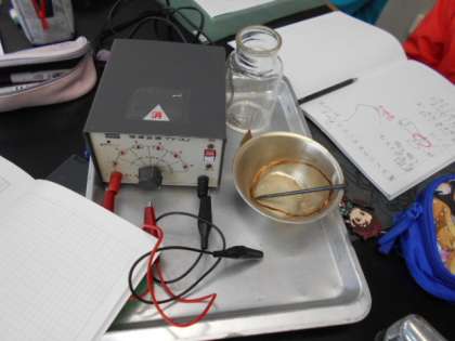 電源装置,コイル,鉄のくぎを使って集気びんの中のクリップを取り出します。取り出す実験をして,不思議に思ったことや,調べてみたいことを話し合っています。