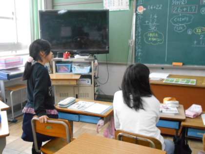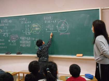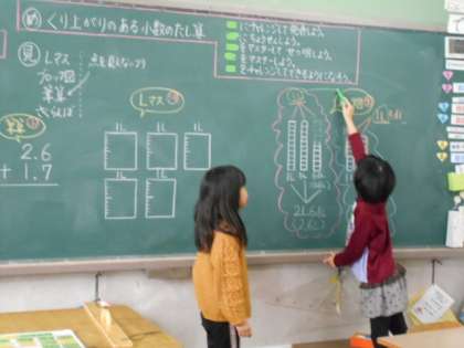 小数のたし算をしています。自分の考えを黒板に書いて,しっかりと説明しています。友達の意見もみんなよく聞いています。