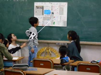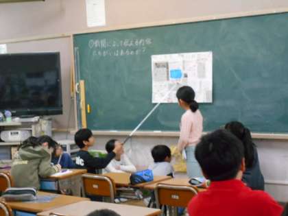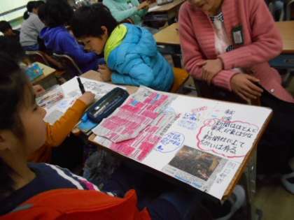 新聞社による記事の取り上げ方に違いがあるのかを調べ,グループでまとめています。トップ記事が違うこと,天気予報はすべての新聞に載っていること等,気づいたことや感じたことを上手に説明しています。