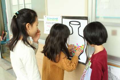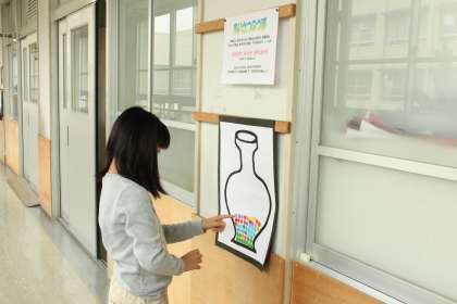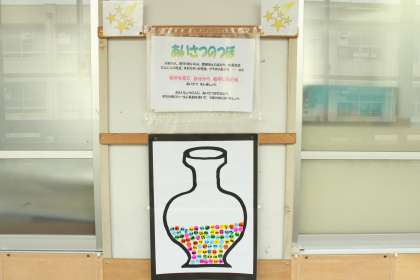 「自分から,相手を見て,相手に伝わるあいさつ」を5人以上の人にできた人はシールを貼って,つぼにためていきます。3年生の元気のよい挨拶が廊下まで響き渡っています。
