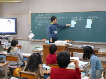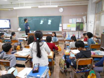 箱に紙を貼り,どのような形の面から箱ができているのかを考えます。箱を開いた形を見て,気付いたことを発表しています。