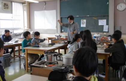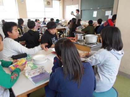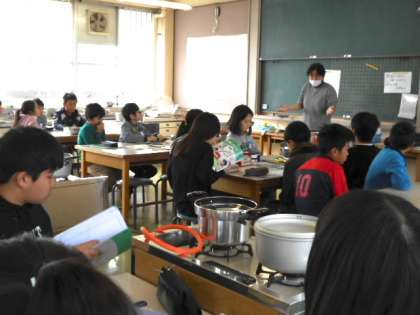 カレーライスを調理実習で作ります。材料や目的に応じたゆで方やいため方についての学習です。必要な用具をそろえて点検しています。