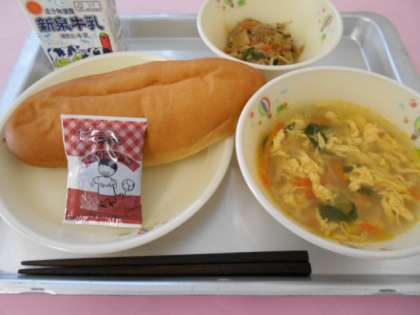 今日の給食の小おかずは,ビーフンを使った献立でした。一般的にビーフンの料理は中華ベースのだしに,しょうゆ味が多いですが,きょうは甘辛いみそにごまの風味を効かせた味付けです。ビーフンは米粉から作られています。小麦粉の麺に比べて,のびにくく歯ごたえもしっかりと残り,食べごたえのあるおかずです。