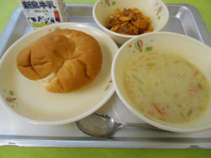 ニュージーランドのウェリントン市は,堺市と姉妹都市として提携しています。そのニュージーランドでさつまいもを意味するのが「クマラ」です。さつまいもを使って,カレー粉で風味づけしたクマラスープが,今日の給食に登場しました。牛乳やバーターなどの乳製品をベースに,味付けはの中心は塩です。あまり馴染みのない味ですが,さつまいもの裏ごしもたっぷり使い,ほんのりと甘みのあるスープです。