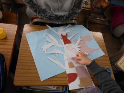 国語の読み物の「モチモチの木」を紙版画で表します。刷り上がりを想像しながら,版をつくっていきます。