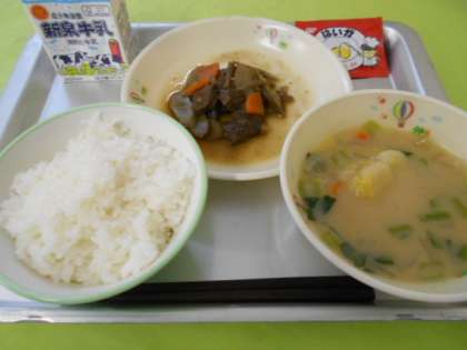 今日の給食はその時代,同じように小学校の給食で提供されていた,鯨肉の煮物と,小麦粉を練って作ったすいとんが入ったみそ汁です。鯨肉は,栄養豊富な食材です。最近は食する機会も減り珍しくなりましたが,しっかりと噛んで,味わっていた様子でした。