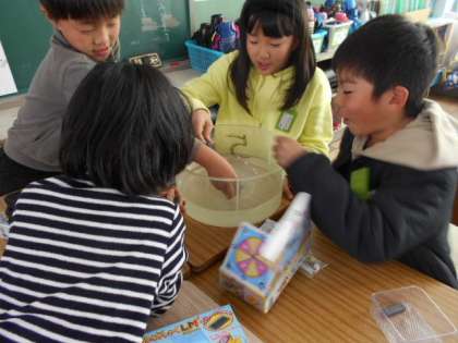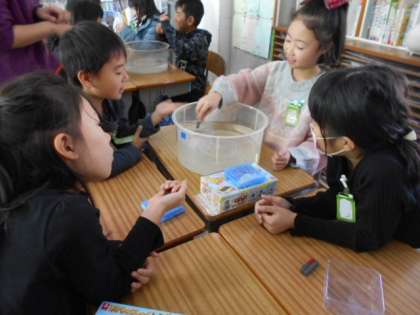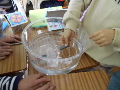 水に浮かべた船を磁石を使ってうまく動かすことができるでしょうか。磁石の極について調べています。