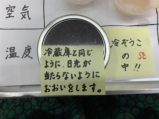 温度を比較するカップは「冷たい」を日光の当たらない冷蔵庫の中に入れているので,条件を同じにするべく,おおいをしています。