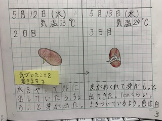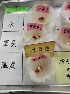 「水あり」「空気あり」「あたたかい」のカップの豆からニョロニョロと,芽が伸びました!!みなさんの種子の様子もまた,教えてくださいね。