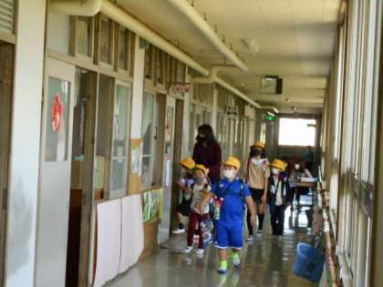 登校後,手洗いをしています。朝の教室では健康観察や,宿題提出,スケジュールの説明が行われました。