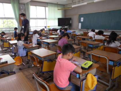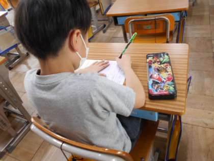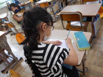 漢字の学習プリントをしています。丁寧な字で書いています。