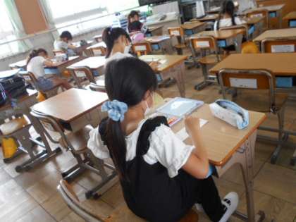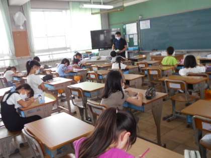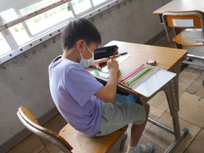 保健室で行っている視力検査の順番を待っている間,日直の札を作っています。自分の名前を書いたあと,周りをきれいにデザインしています。