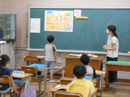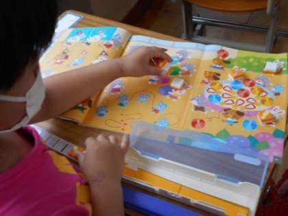 教科書のイラストを見て,6つあるものを探しています。ブロックを置いて,6つかどうかを確かめています。