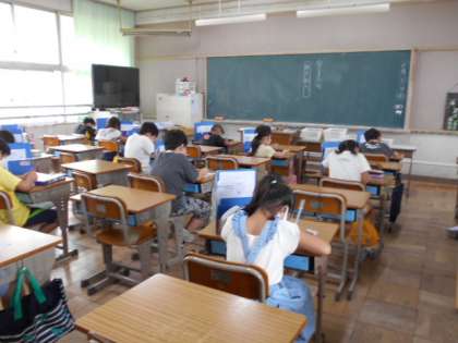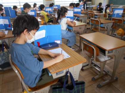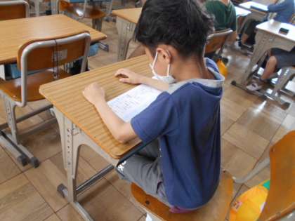 習った漢字をドリルで復習し,テストをします。何問正解できるでしょうか? みんな頑張っています。