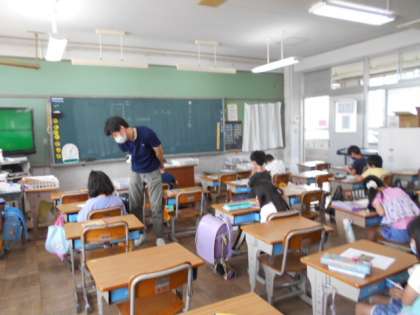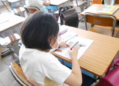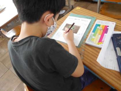 学習園で野菜を育てています。野菜の写真を見て,気付いたことや思ったことをワークシートに書いています。