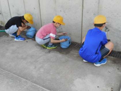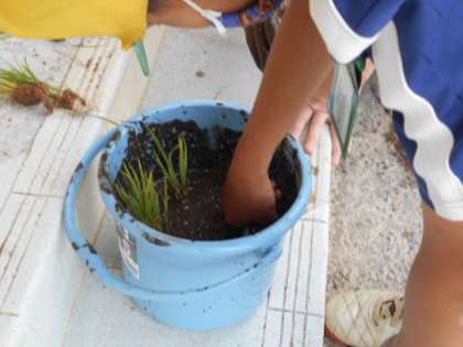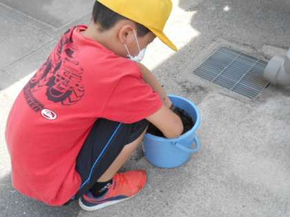 バケツで稲を育てます。土づくりをして,水を入れ,苗を植えていきます。うまく育つといいですね。