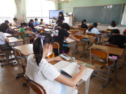 筆者の主張や意図をとらえ、自分の考えを発表します。まずは,事例と主張がどこにどのように書かれているかを確かめています。