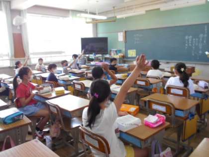 国語辞典を使って言葉調べをしています。「スパゲティ」「うどん」「ラーメン」それぞれ調べて意味の説明を一緒に読みます。何の仲間の言葉かを考え,ほかにどんな言葉があるかも発表しています。