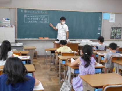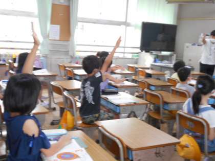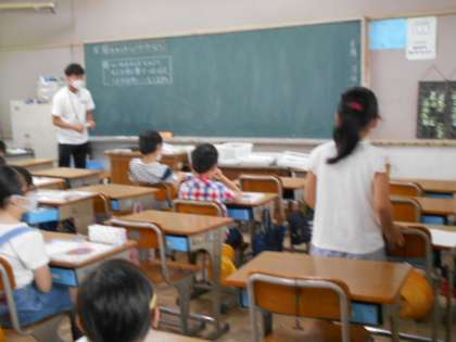 12個のお菓子を4人で同じ数ずつ分けると,1人分は何個になるかを考えます。わかっていることが何で,問われていることは何かをみんなで確認しています。