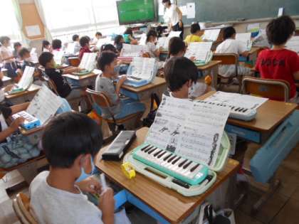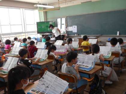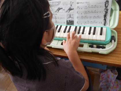吹かずに,鍵盤を使って指くぐりの練習をしています。うまく指使いができるでしょうか。