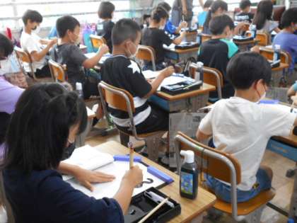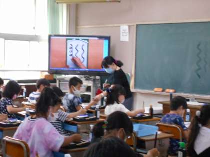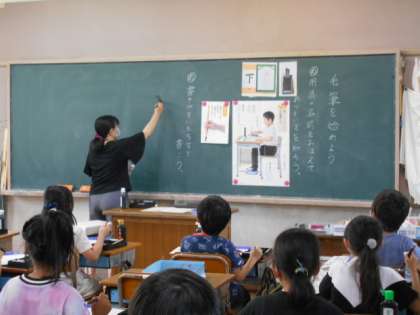 初めての毛筆です。姿勢を正し,筆をまっすぐに持って書きます。