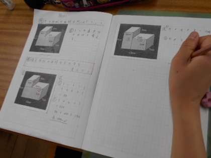 複合図形の体積を求めます。たし算や引き算を使ったり,実際に1㎤の積み木を使って確かめたり,自分の方法で考えています。