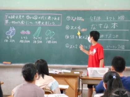一つの値段は,トマトが100円,きゅうりが50円,ピーマンが30円,なすはX円です。野菜を買う代金をそれぞれの金額に合わせて式に表します。文字を使った立式の練習です。