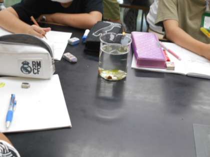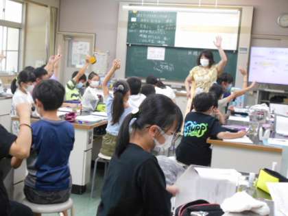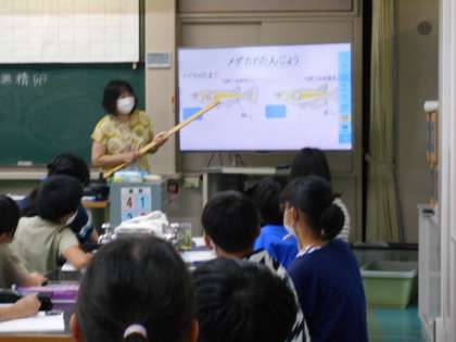 メダカのオスとメスの体の特徴を知った5年生。ビーカーの中のメダカはオスかメスかを調べます。