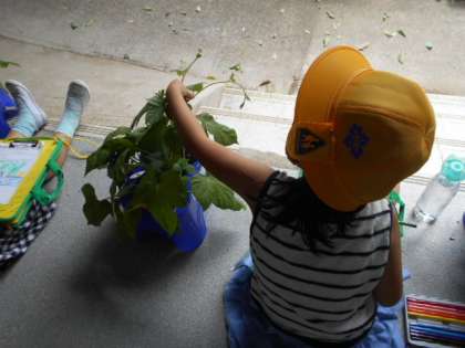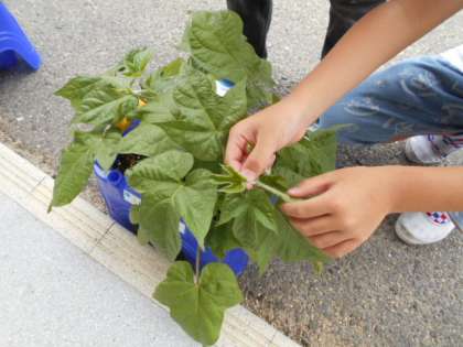 朝顔の観察をしています。葉っぱの色や形,数,つるの様子をしっかりと見ています。