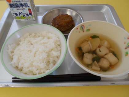 今日の給食はハンバーグでした。夏本番を間近に控え暑い日が続きますが,大根おろしのタレでさっぱりした味付けです。