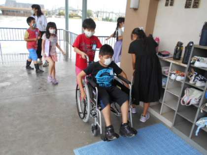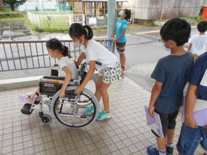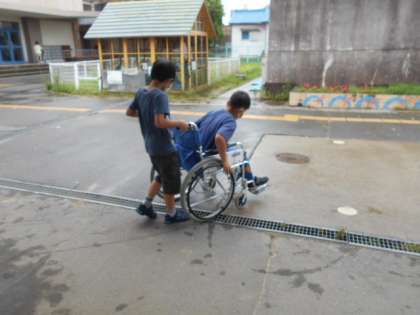 7月6日,4年生が総合的な学習で車いす体験を行いました。想像していたよりも,移動が大変であることが実感できたようです。