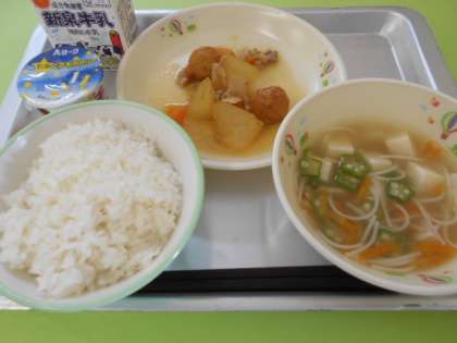 給食の『七夕椀』はすましのにゅうめん汁ですが,そうめんを天の川に,オクラを星形に見立てています。夏野菜の冬瓜やゼリーもあります。